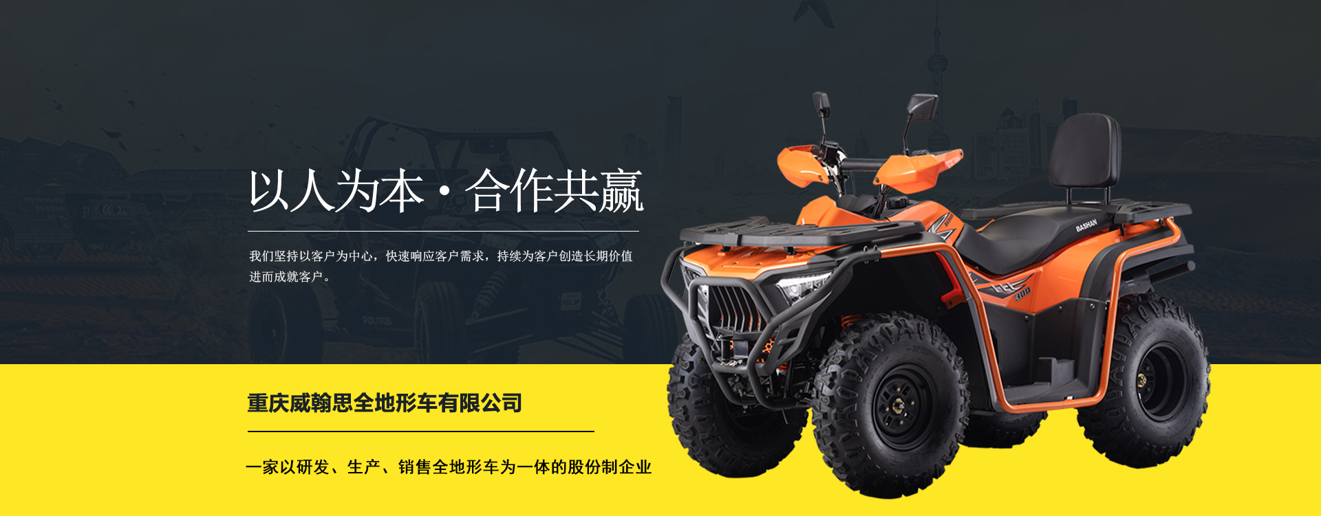 重慶威翰思全地形車有限公司成立于2016年9月,一家以研發(fā)、生產(chǎn)、銷售全地形車為一體的股份制企業(yè)。公司銷售額超過5000萬。現(xiàn)有專業(yè)市場售后服務(wù)團隊。公司秉承“敬業(yè)、超越、活力、用戶至上”的企業(yè)精神,“以人為本,合作共贏;”的核心價值觀,“嚴格管理創(chuàng)優(yōu)質(zhì)、名牌戰(zhàn)略拓市場”的質(zhì)量方針,使公司一步步邁上新的臺階。公司與重慶航天巴山摩托車制造公司達成戰(zhàn)略合作協(xié)議。共同出資致力于沙灘車旅游市場產(chǎn)品研發(fā),項自運營指導(dǎo),市場維護等全方位市場拓展。重慶航天巴山摩托車制造公司授權(quán);重慶威翰思全地形車有限公司為中國區(qū)唯─戰(zhàn)略合作伙伴。